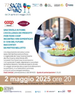 Coop Casarsa al fianco della Sagra del Vino di Casarsa della Delizia (24 aprile-2 maggio). Anche quest’anno oltre a essere tra gli sponsor della manifestazione e a rifornire i chioschi, Coop Casarsa sostiene un evento del programma: la serata a base di prodotti Fior Fiore Coop con vini antichi e moderni al ristorante Al Posta (Via Valvasone, Casarsa) il 2 maggio alle 20.